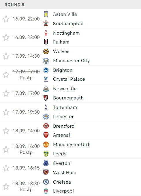 Не у запланований день 18 вересня буде проведено центральну гру 8-го туру чемпіонату Англії між «Челсі» та «Ліверпулем». Також перенесені зустрічі «Манчестер Юнайтед» та «Лідса», а також «Брайтона» з «Крістал Пелас».