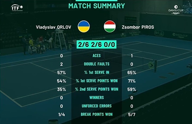 У другому матчі лідер української збірної Владислав Орлов (№530 ATP) програв другому номеру угорців Жомбору Пірошу (№159 АТР).