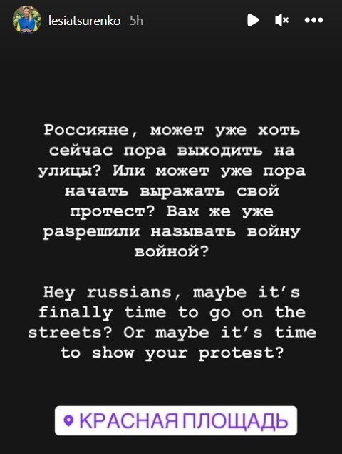 «Росіяни, може вже хоч зараз настав час виходити на вулиці? Чи, може, вже час почати висловлювати свій протест? Вам уже дозволили називати війну війною?».