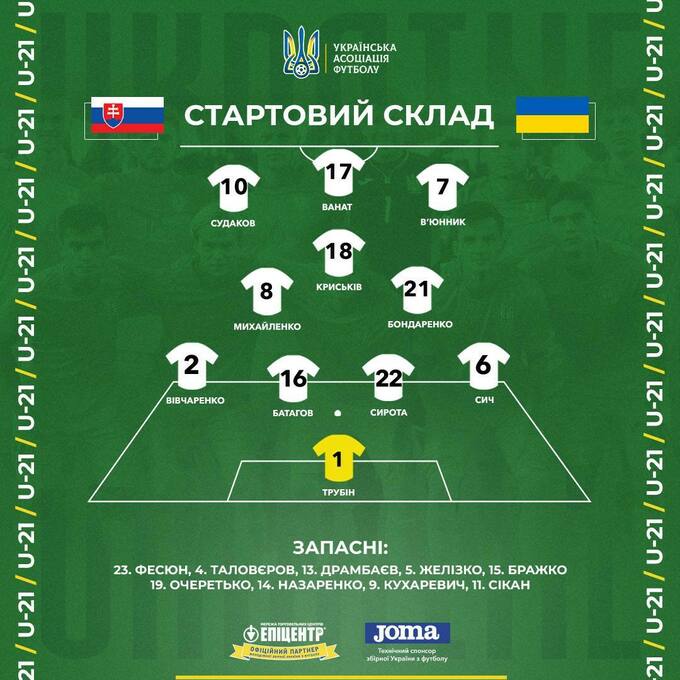 Україна U-21: Трубін – Вівчаренко, Батагов, Сирота, Сич – Михайленко, Криськів, Бондаренко – Судаков, Ванат, В'юнник