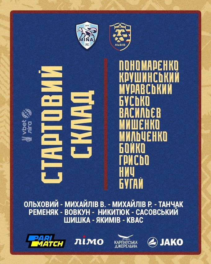 ФК «Львів»: Пономаренко – Бусько, Муравський, Крушинський (Никитюк, 77) – Мишенко (Шишка, 9), Васильєв, Бойко, Мильченко, Грисьо – Бугай (Ременяк, 28, Вовкун, 77), Нич.