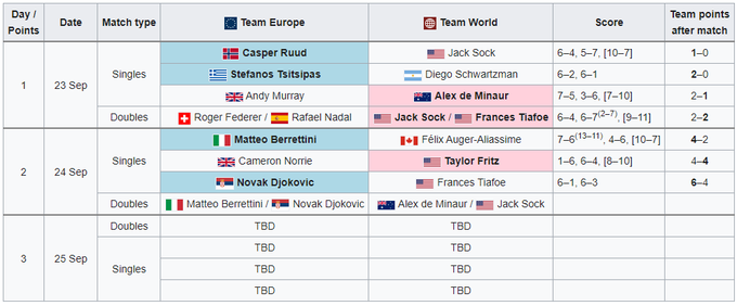 Після 7 матчів Європа перемагає команду решти світу (6:4). Перемоги у другий день змагань приносять команді по 2 очки.