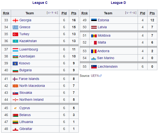 - Кошик 5: Словаччина, Північна Ірландія, Кіпр, Білорусь, Литва, Гібралтар, Естонія, Латвія, Молдова, Мальта.