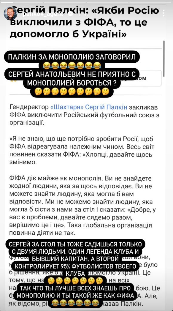 – Палкін за монополію заговорив. Сергію Анатолійовичу, неприємно з монополією боротися? Сергію, за стіл ти теж сідаєш тільки з двома людьми. Один – легенда клубу та колишній капітан, а другий контролює 95% футболістів твого клубу. Тож ти краще знаєш про монополію, і ти такий же, як і ФІФА, – написав Панков в інстаграмі.