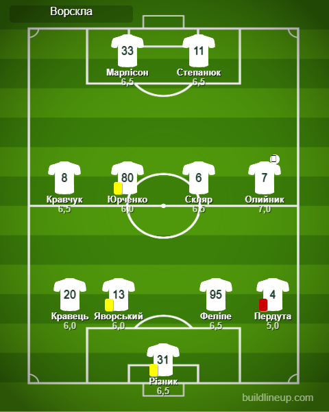 «Ворскла»: Різник, Пердута, Скляр, Кравчук (Сефері, 59), Степанюк, Олійник, Яворський, Кравець, Марлісон, Феліпе, Юрченко.