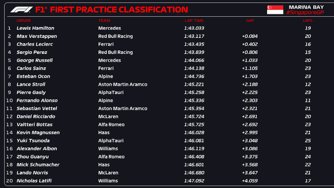 У першому тренуванні найшвидшим був пілот Мерседеса Льюїс Хемілтон. Раніше британець казав, що вулична траса має підійти для болідів команди. Топ-3 замкнули Макс Ферстаппен та Шарль Леклер.