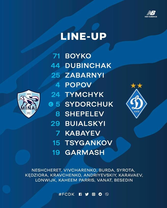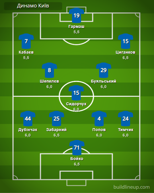 «Динамо» Київ: Бойко – Дубінчак (Вівчаренко, 68), Забарний, Попов, Тимчик – Шепелєв (Лонвейк, 82), Сидорчук, Буяльський – Кабаєв (Перріс, 75), Гармаш (Бєсєдін, 67), Циганков.
