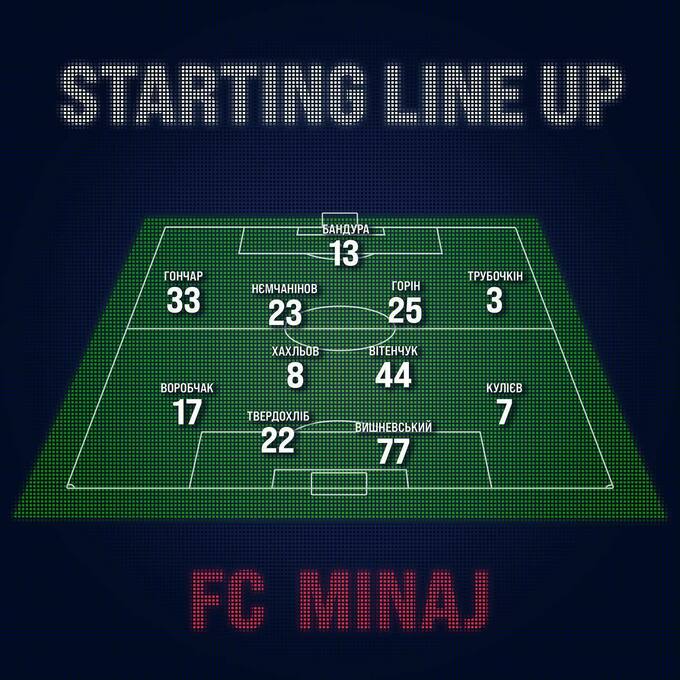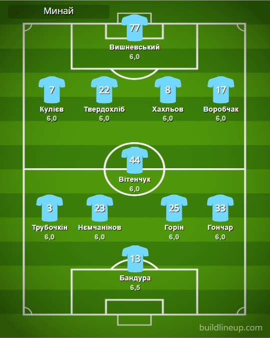 «Минай»: Бандура – Трубочкін (Рогозинський, 83), Нємчанінов, Горін, Гончар – Вітенчук – Кулієв, Твердохліб, Хахльов (Байдал, 78), Воробчак (Касімов, 78) – Вишневський (Колесник, 77).