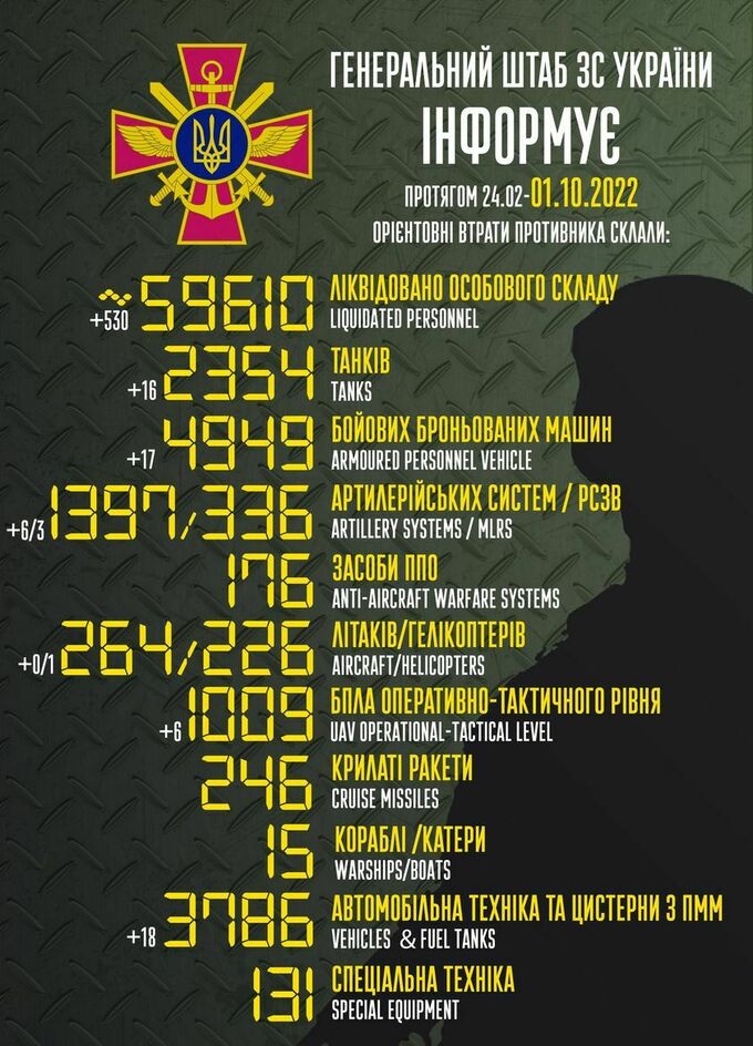 Пропонуємо до вашої уваги зведення загальних бойових втрат росії з 24.02 по 01.10.