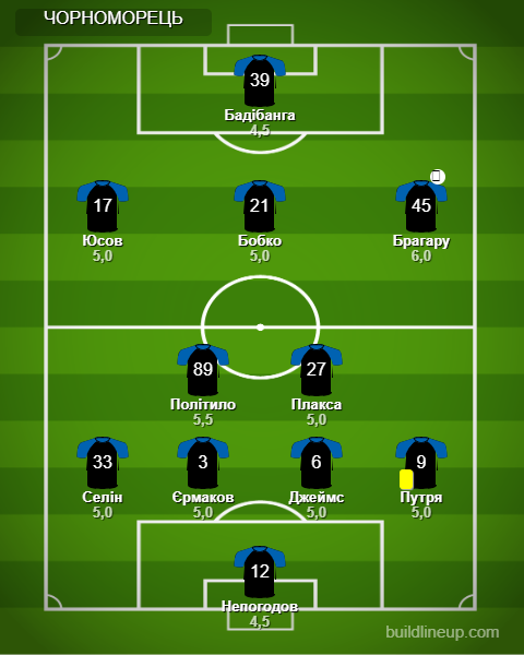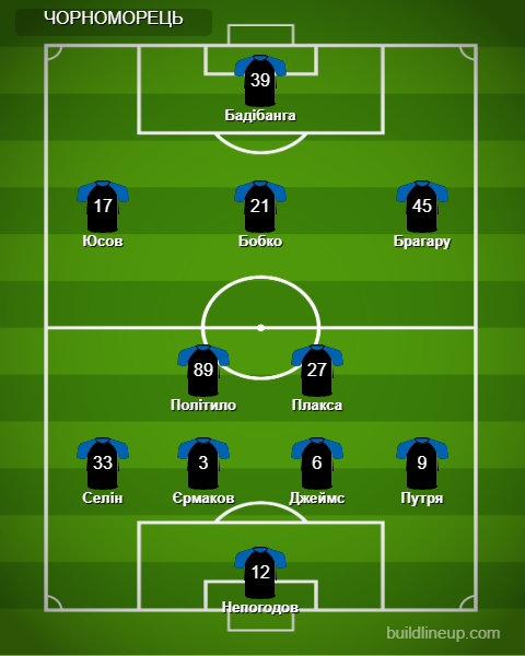 «Чорноморець»: Непогодов - Путря (Кузик, 90+1), Джеймс, В. Єрмаков, Селін (Салюк, 90+1) - Плакса (Наумець, 59), Політило - Юсов, Бобко, Брагару - Бадібанга (Паст, 51, Варакута, 58).