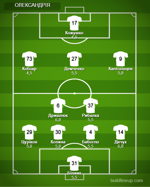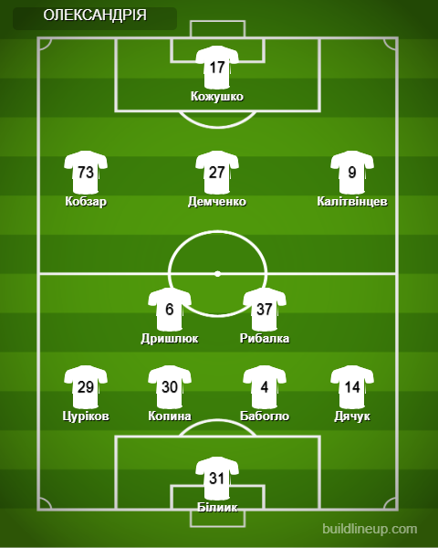 «Олександрія»: Білик - Дячук, Бабогло, Копина (Мірошніченко, 37), Цуріков - Рибалка, Дришлюк - Калітвінцев, Демченко (Ковалець, 80), Кобзар (Третьяков, 67) - Кожушко (В. Волошин, 67).