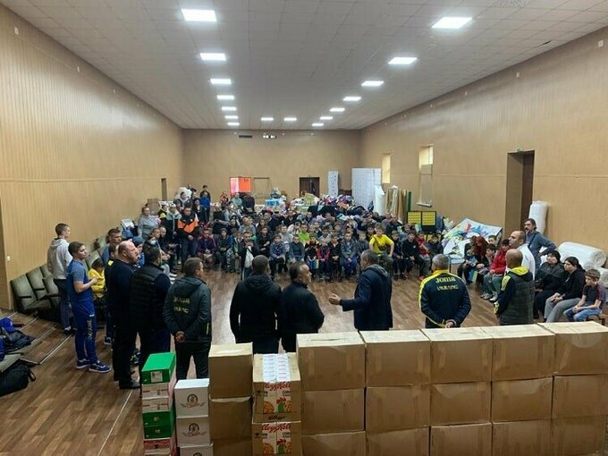 Одразу після наради її учасники відвідали один із шелтерів для вимушених переселенців, який базується в селі Сурсько-Литовське. Тут зараз перебуває близько 500 осіб, 130 з яких — діти. Представники УАФ привезли їм продукти харчування, теплі речі, медичні засоби та подарунки для малечі, зокрема — новенькі м’ячі, яким діти дуже зраділи.