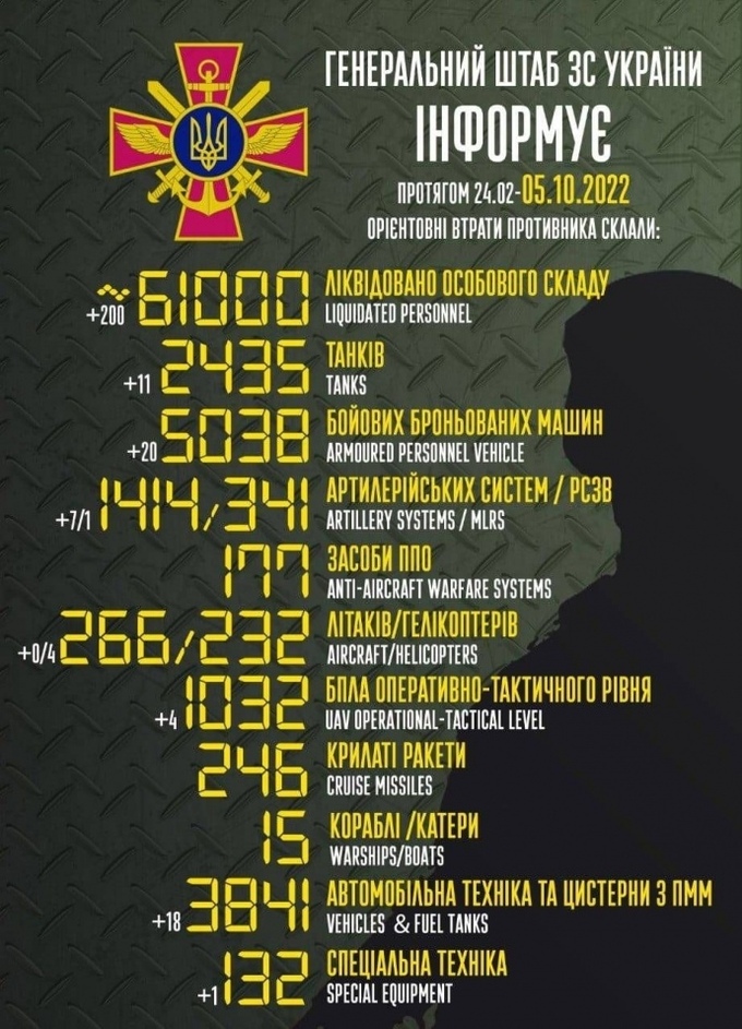 Пропонуємо до вашої уваги зведення загальних бойових втрат росії з 24.02 по 05.10.