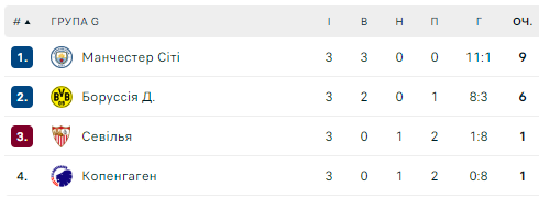 Ситуація у групі G: «Ман Сіті» (9 очок), «Боруcсія» Д (6), «Севілья» та «Копенгаген» (по 1).