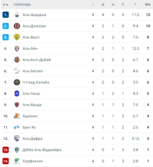 Чемпіонат ОАЕ. Турнірна таблиця після 4 турів