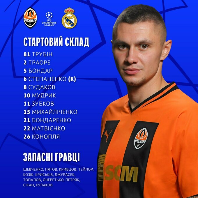 «Шахтар»: Трубін – Михайліченко, Матвієнко, Бондар, Конопля – Степаненко – Мудрик (Петряк, 85), Судаков (Джурасек, 81), Бондаренко, Зубков (Л. Тейлор, 82) – Траоре (Сікан, 76).