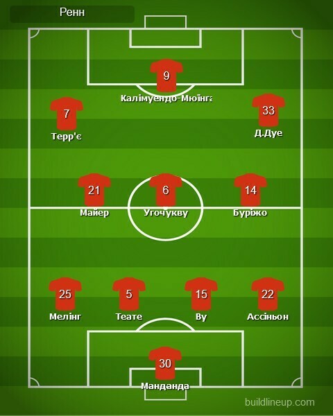 «Ренн»: Манданда, Мелінг, Теат, Ву, Ассіньйон, Майєр, Угочукву, Буріжо (Трюффер, 84), Терр'є (Сулемана, 66), Калімуендо-Муїнга (Тет, 73), Д.Дуе (Гуйрі, 73)