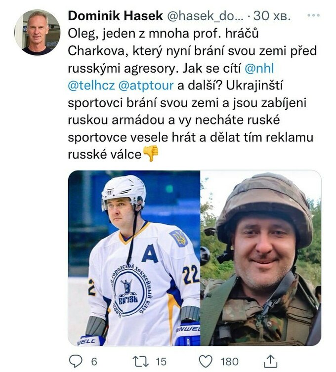 «Олег, один із багатьох професійних гравців з Харкова, який зараз захищає свою країну від російських агресорів, - пише Гашек. - Як почуваються NHL, Екстраліга, ATP Tour та інші? Українські спортовці захищають свою країну і гинуть від російської армії, а ви даєте російським спортовцям весело грати і рекламувати російську війну».