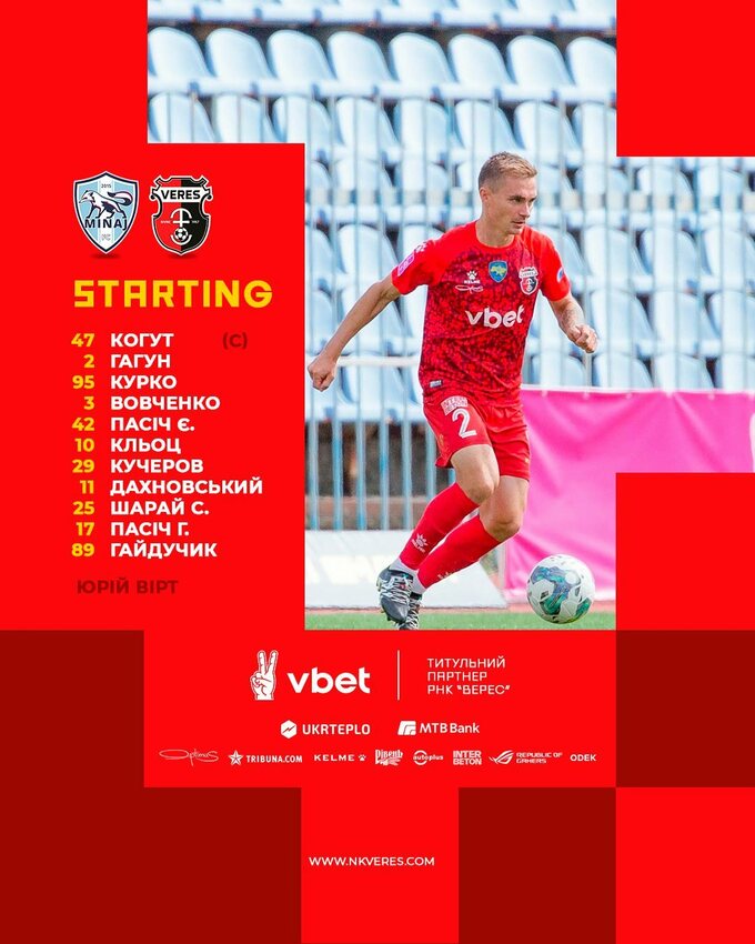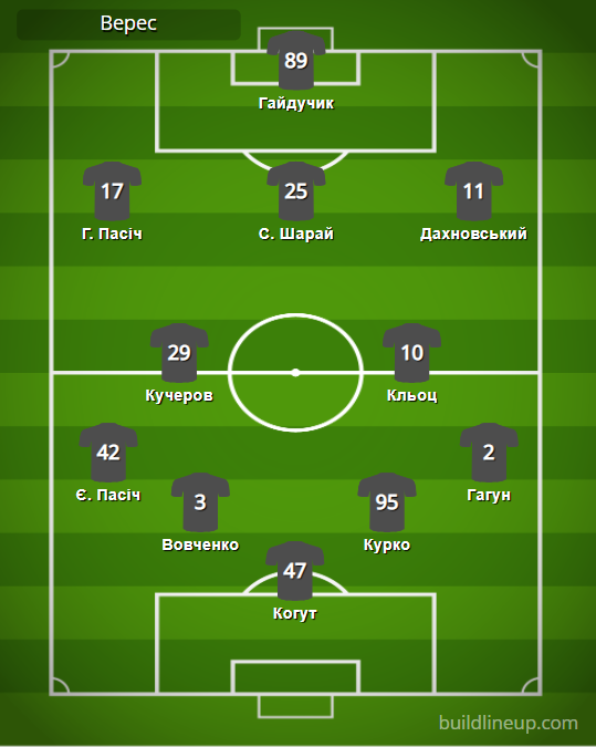 «Верес»: Когут – Є. Пасіч, Вовченко, Курко, Гагун – Кучеров, Кльоц – Г. Пасіч, С. Шарай (Лебеденко, 71), Дахновський (В. Шарай, 75) – Гайдучик (Сергійчук, 70).