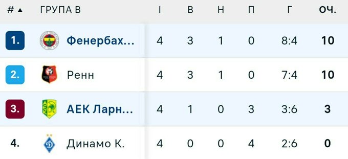 Наразі «Фенербахче» з 10 очками ділить перше місце з «Ренном» у групі В. АЕК разом із київським «Динамо» боротиметься за Лігу конференцій.