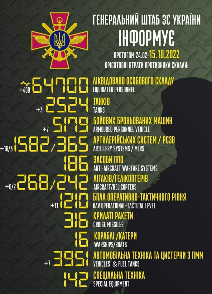 Пропонуємо до вашої уваги зведення загальних бойових втрат росії з 24.02 по 15.10.