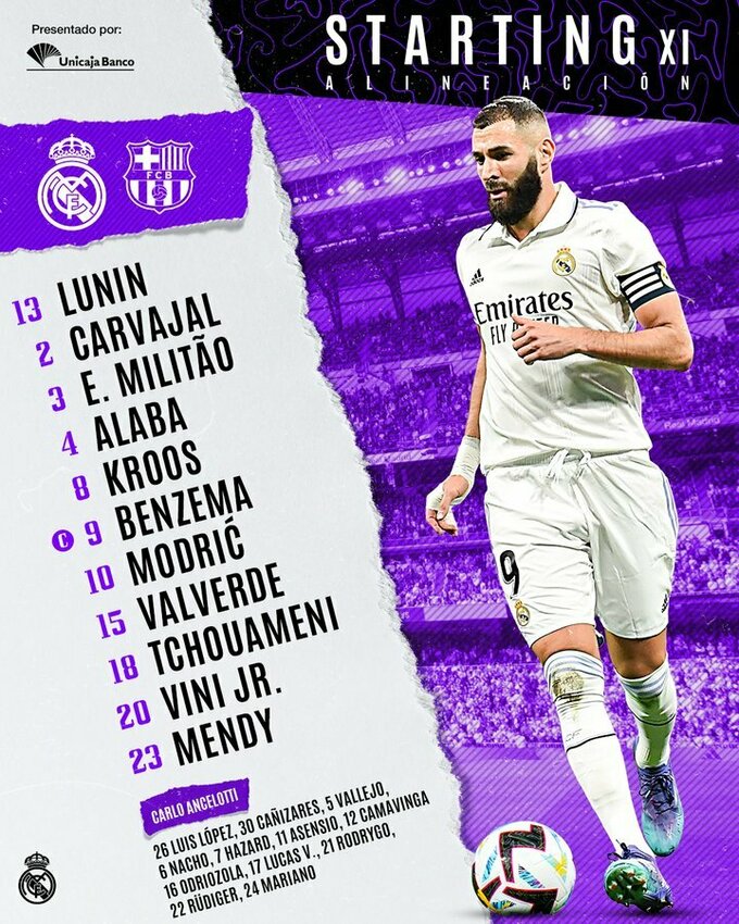 Стартовий склад «Реала»: Лунін, Карвахаль, Мілітао, Алаба, Менді, Кроос, Модріч, Чуамені, Вальверде, Бензема, Вінісіус Жуніор.