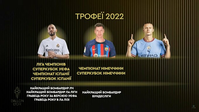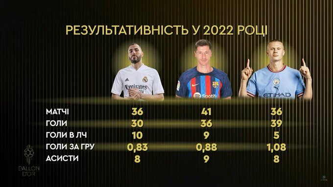 Фаворитами на отримання Золотого м'яча є Карім Бензема (Франція, Реал), Ерлінг Холанд (Норвегія, Ман Сіті), Кіліан Мбаппе (Франція, ПСЖ).