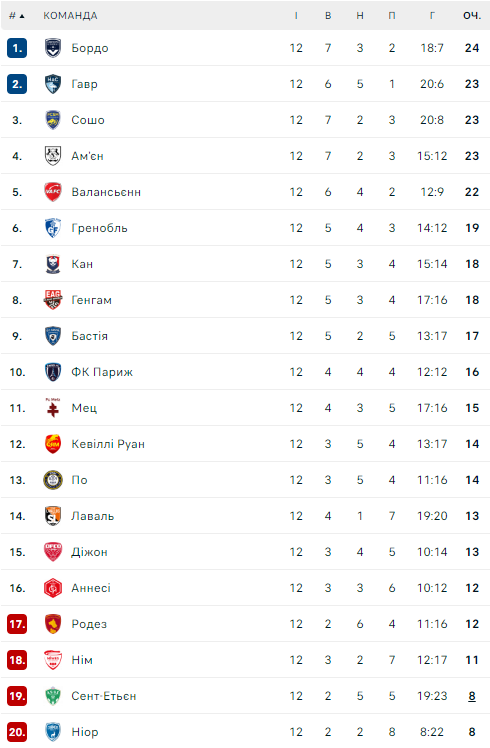 У Лізі 2 пройшло 12 турів, і «Бордо» очолює турнірну таблицю (24 очки). Ігнатенко зіграв 11 матчів та забив 2 голи.