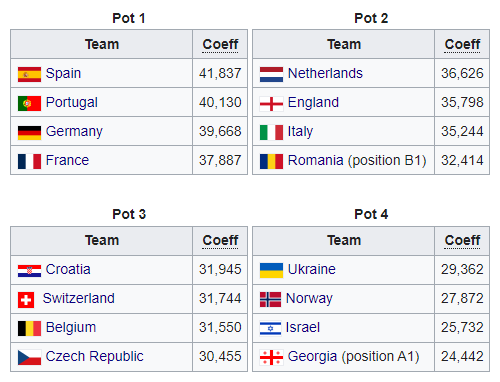 Грузія призначена на позицію А1, а Румунія призначена на позицію В1. Таким чином, при виборі цих команд із відповідних кошиків групи A та B недоступні для інших команд у відповідних кошиках.