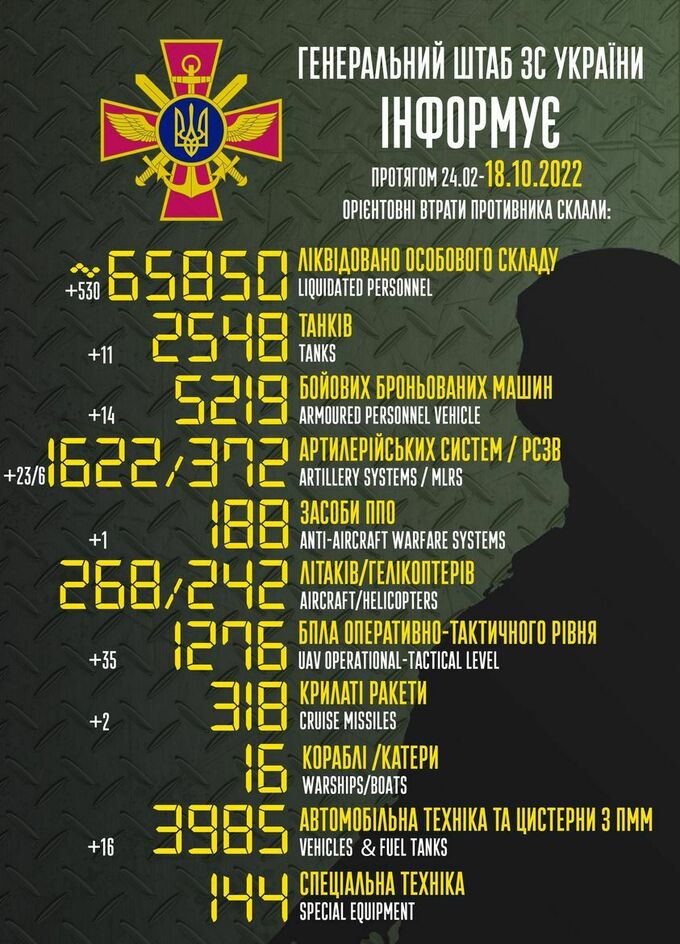 Пропонуємо до вашої уваги зведення загальних бойових втрат росії з 24.02 по 18.10.