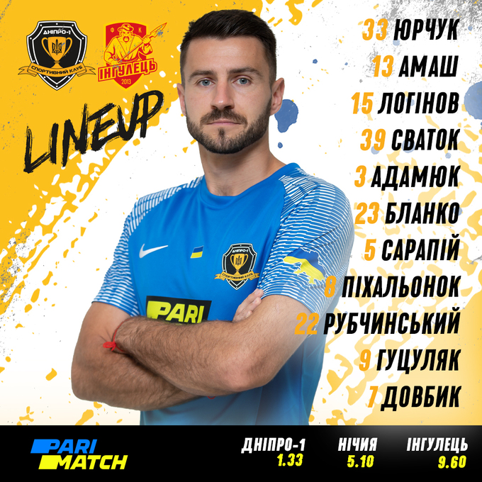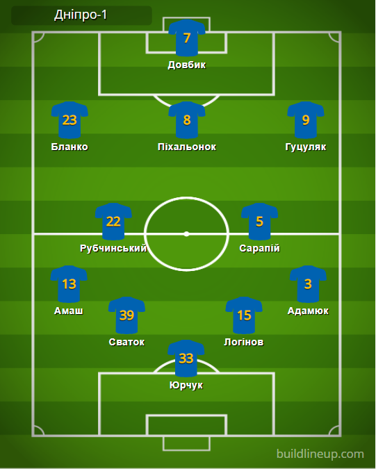 «Дніпро-1»: Юрчук – Амаш, Сваток, Логінов (Громов, 59, Балулі, 80), Адамюк (Танчик, 70) – Рубчинський (Назаренко, 59), Сарапій – Бланко (Когут, 81), Піхальонок, Гуцуляк – Довбик.