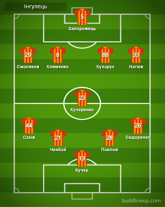 «Інгулець»: Кучер – Саків, Ченбай, Павлов, Сидоренко – Кучеренко – Смоляков (Кравчук, 76), Клименко (Марусич, 85), Кухарук, Нагієв (Одарюк, 76) – Запорожець (Коробенко, 90+2).
