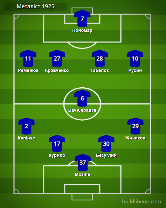 «Металіст 1925»: Мозіль – Капінус, Курило, Безуглий, Жичиков – Габелок, Кравченко, Вачіберадзе – Русин (Бичек, 75), Пономар, Ременюк.