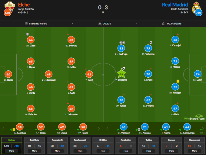 Голами у галактикос відзначилися Федеріко Вальверде, Карім Бензема та Марко Асенсіо. «Реал» впевнено лідирує в чемпіонаті Іспанії (28 очок), а «Ельче» посідає останнє, 20-те місце (3 очки).