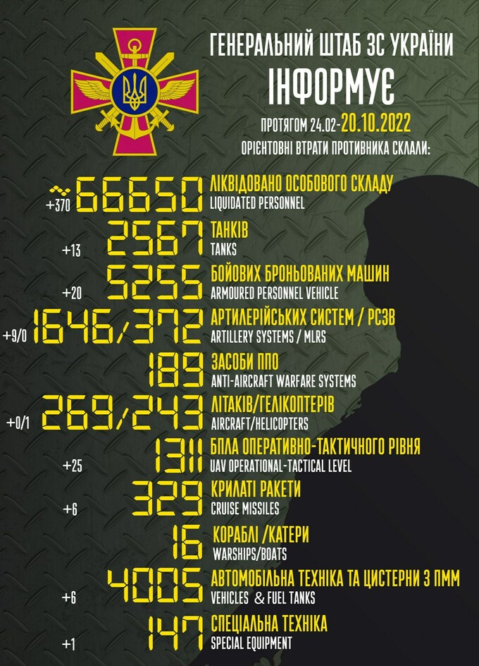 Пропонуємо до вашої уваги зведення загальних бойових втрат росії з 24.02 по 20.10.