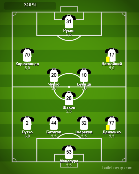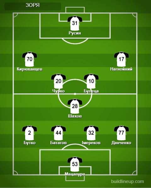 «Зоря»: Мацапура – Бутко, Батагов, Імереков, Данченко – Шахов, Чурко (Мишньов, 76), Булеца (Бражко, 65) – Русин (Хлань, 88), Нагнойний (Антюх, 65), Кирюханцев (Луньов, 76).