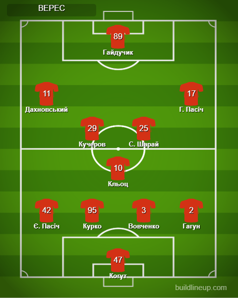 «Верес»: Когут – Є. Пасіч, Вовченко, Курко, Гагун – Кучеров, Кльоц, С. Шарай (Лебеденко, 71) – Г. Пасіч (В. Шарай, 78), Гайдучик (М. Шестаков, 71), Дахновський (Сергійчук, 71).
