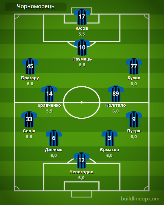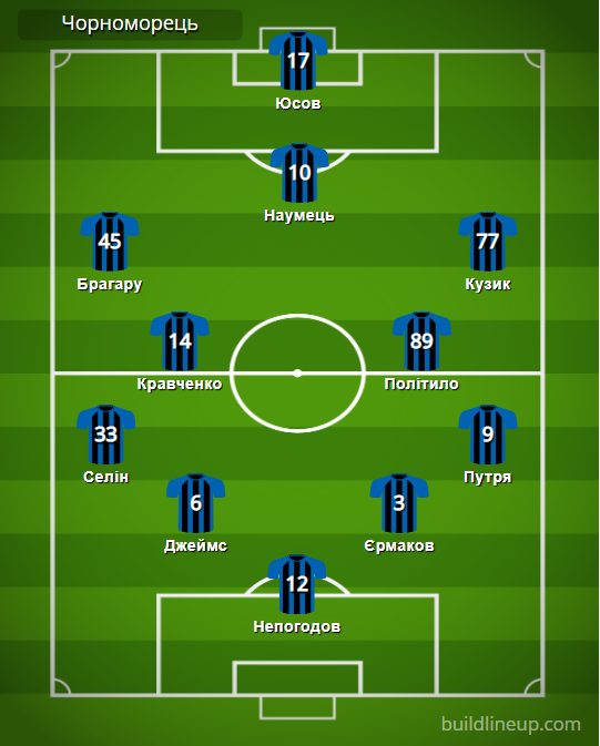 «Чорноморець»: Непогодов – Селін, Джеймс, Єрмаков, Путря – Кравченко, Політило – Брагару, Наумець (Бадібанга, 73), О. Кузик (Штогрін, 73, Філі, 88) – Юсов (Гладкий, 73).