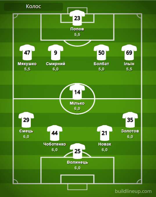«Колос»: Волинець – Ємець, Чоботенко, Новак, Золотов – Мілько (Ісаєнко, 68) – Мякушко, Смирний, Болбат (Оріховський, 58), Ільїн (Д. Кузик, 81) – Попов (Безбородько, 46).