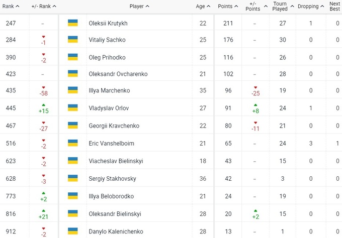 Щодо українців, то практично всі втратили позиції, покращили становище лише Владислав Орлов, Олександр Бєлінський та Ілля Білобородько.