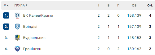 У перших турах «Будівельник» переміг італійський «Бріндізі» (74:70), а потім поступився естонському «Калеву» (74:83). «Гронінген» зазнав двох поразок і замикає турнірну таблицю. До другого етапу вийдуть дві найкращі команди групи.