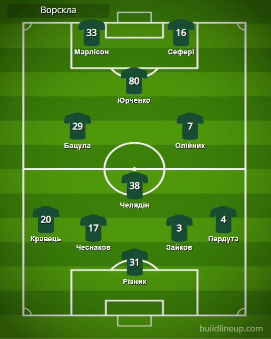 «Ворскла»: Різник – Кравець, Чеснаков, Зайков, Пердута – Челядін (Толі, 63) – Бацула (Нестеренко, 80), Олійник (Степанюк, 81) – Юрченко (Феліпе, 76) – Марлісон, Сефері.