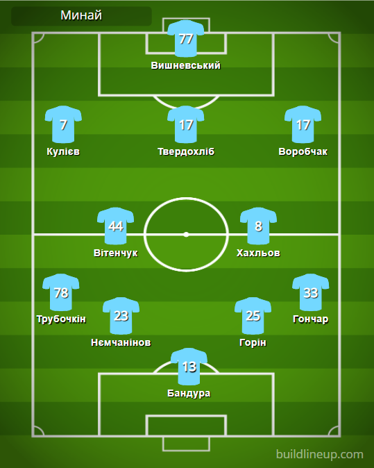 «Минай»: Бандура – Трубочкін, Нємчанінов, Горін, Гончар – Вітенчук (Байдал, 76), Хахльов (Паламар, 86) – Кулієв (Коломоєць, 75), Твердохліб, Воробчак – Вишневський (Колесник, 67).