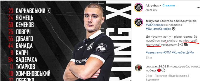 Офіційна сторінка ФК «Кривбас» в Інстаграмі вважає, що трансляція на 2+2 - піратська.