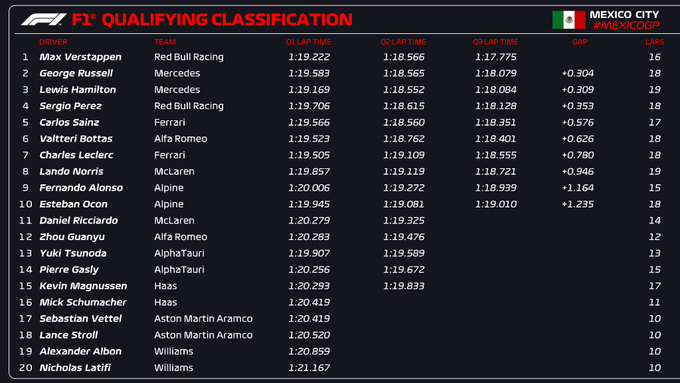 Топ-10: Ферстаппен, Расселл, Хемілтон, Перес, Сайнс, Боттас, Леклер, Норріс, Алонсо, Окон