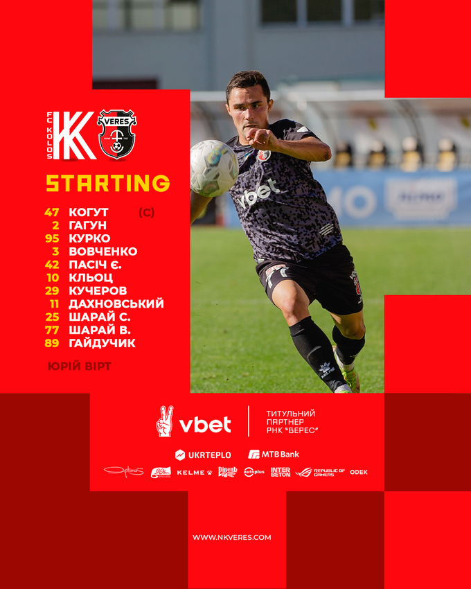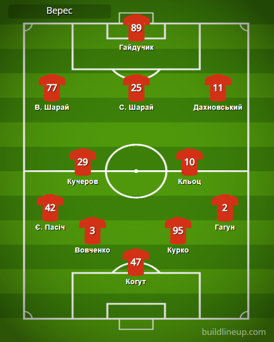 «Верес»: Когут – Є. Пасіч, Вовченко, Курко, Гагун – Кучеров, Кльоц (Лебеденко, 78) – В. Шарай, С. Шарай (М. Шестаков, 85), Дахновський – Гайдучик (Сергійчук, 71).