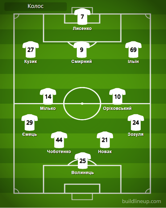 «Колос»: Волинець – Ємець, Чоботенко, Новак, Зозуля – Мілько, Оріховський (Богданов, 75) – Кузик (Болбат, 66), Смирний (Ісаєнко, 80), Ільїн – Лисенко (Попов, 66).