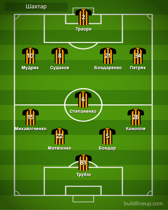 «Шахтар»: Трубін – Михайліченко, Матвієнко, Бондар, Конопля (Л. Тейлор,59) – Степаненко – Мудрик (Тотовицький, 74), Судаков (Джурасек, 59), Бондаренко (Криськів, 81), Петряк – Траоре (Сікан, 59).