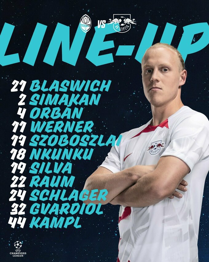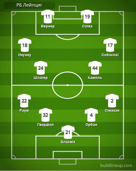 РБ «Лейпциг»: Бласвіх – Раум (Гальстенберг, 67), Гвардіол, Орбан, Сімакан (Генріхс, 67) – Шлагер (Діалло, 75), Кампль – Нкунку, Собослаї (Ольмо, 67) – Вернер (Форсберг, 19), Сілва.