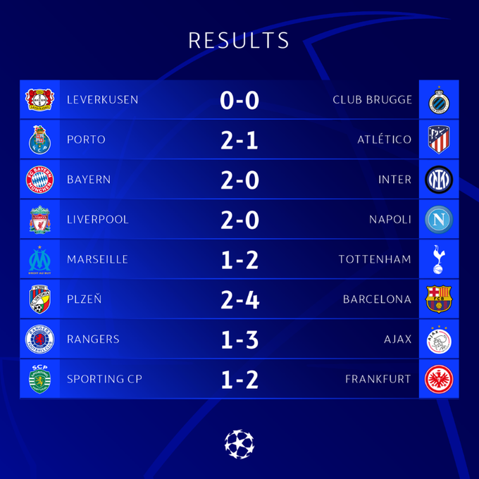Вже визначено 14 з 16 клубів, які пробилися до плей-оф: Наполі, Ліверпуль, Брюгге, Порту, Баварія, Інтер, Тоттенхем, Айнтрахт, Челсі, Реал, Ман Сіті, Боруссія Д, ПСЖ, Бенфіка.